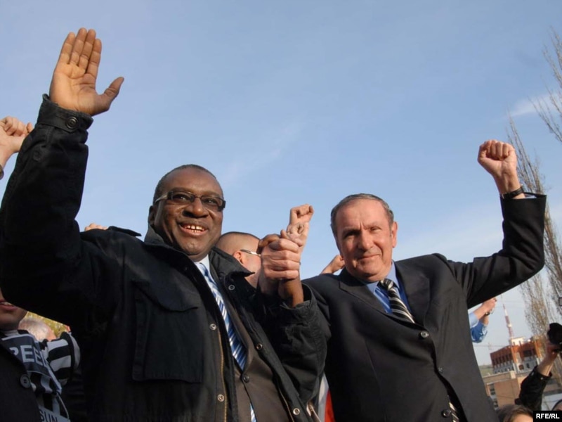 Armenia -- Opposition leader Levon Ter-Petrosian (R) greets a Nigerian participant of an international human rights conference in Yerevan, 06Arp2010