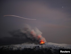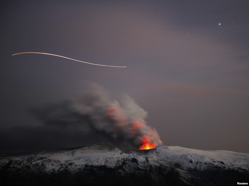 Iceland -- The path of a plane is seen over the top of an erupting volcano near Eyjafjallajokull, 20Apr2010