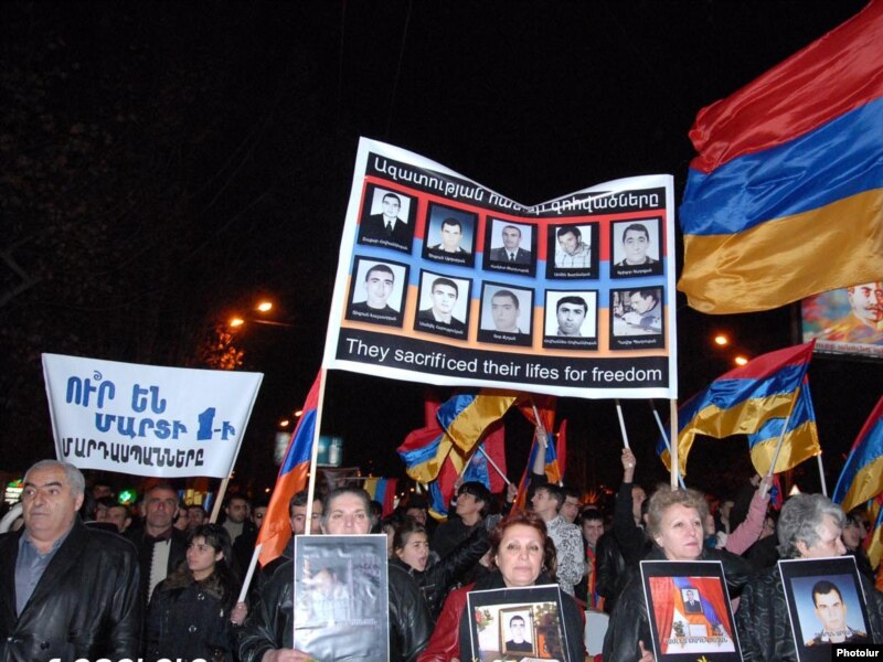 Armenia -- Relatives hold pictures of opposition protesters killed in Yerevan in March 2008 during an opposition rally staged on the second anniversary of the unrest.