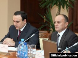 Armenia -- Defense Minister Seyran Ohanian (R) and National Security Council Secretary Artur Baghdasarian chair a meeting of a government commission on defense, 10August 2010.
