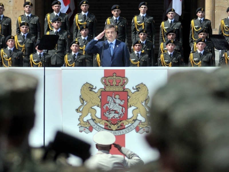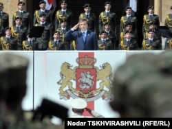 Վրաստան -- Նախագահ Միխեիլ Սահակաշվիլին ողջունում է անկախության տոնի առթիվ անցկացվող ռազմական շքերթի մասնակիցներին, Թբիլիսի, 26-ը մայիսի, 2011թ.