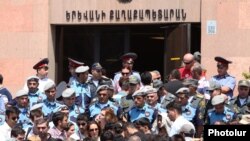Ոստիկանները պատ են կազմել շենքի երկայնքով՝ թույլ չտալով երիտասարդ ակտիվիստներին մոտենալ մուտքին: