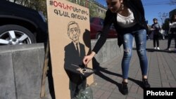 «Մերժիր Սերժին» նախաձեռնության ակցիայի մասնակիցները կոչ էին անում անցորդներին 10 և 20 դրամներ հանգանակել հանուն հեռացող նախագահի։