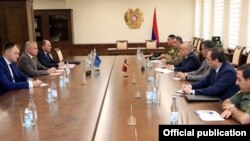 Պաշտպանության նախարարը, մասնավորապես, նշել է. «Մենք Ձեր այցին սպասում էինք դեռ մայիս ամսին: Հայաստանի համար այդ պահին բավական լարված ժամանակահատված էր, բայց, ցավոք սրտի, Ձեր այցը տեղի չունեցավ: Այսօր մեր սահմաններին ձևավորվել է կայուն ծանր իրավիճակ: Մայիս ամսին ադրբեջանական զինված ուժերը, երկու ուղղությամբ, ներխուժեցին հայկական տարածք: Դա մեզ անչափ անհանգստացնում է: Մենք խաղաղության կողմնակից ենք: Մենք, որևէ պարագայում, չենք ուզում իրադրության լարում մեր սահմաններին: Միևնույն ժամանակ, մենք պատրաստ չենք համակերպվել գործողությունների հետ, որոնք կարող են հանգեցնել Հայաստանի պետական սահմանի խախտմանը: Մենք վճռականորեն պաշտպանելու ենք մեր տարածքները: Մենք, իհարկե, ձգտում ենք խաղաղ ճանապարհով լուծել այս խնդիրը՝ ի ցույց դնելով մեր խաղաղասիրությունը: Միևնույն ժանանակ, մեր համբերությունը նույնպես անսպառ չէ, և մեր սահմաններին ստեղծված իրադրության խաղաղ հանգուցալուծման բացակայության պարագայում մենք իրավունք ենք վերապահում խնդիրը լուծել ուժի կիրառմամբ»: