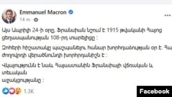 «Այս Ապրիլի 24-ի օրը Ֆրանսիան նշում է 1915 թվականի Հայոց ցեղասպանության 108-րդ տարելիցը», - ֆեյսբուքյան իր էջում գրել է Ֆրանսիայի նախագահ Էմանյուել Մակրոնը։
