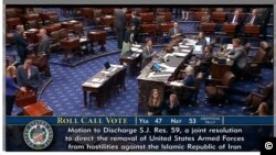 «Պատերազմական լիազորությունների մասին» բանաձևը պահանջում է, որ Իրանի դեմ որևէ նոր ռազմական գործողություն իրականացնելու համար նախագահը ստանա Կոնգրեսի հաստատումը։ Սենատում այն մերժվել է 53 դեմ և 47 կողմ հարաբերակցությամբ։