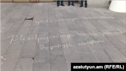 Կեսօրին կառավարության 3-րդ՝ հսկա մասնաշենքի շեմին, որտեղով ամեն օր անցնում-դառնում են Աշխատանքի և սոցիալական հարցերի նախարարության աշխատակիցները, կավիճով արված բազմաթիվ գրառումներ հայտնվեցին՝ «արցախցին բեռ չէ, արցախցին պոտենցիալ է» արտահայտությունից մինչև «արդարություն»: Այս ֆլեշմոբով մի խումբ արցախցիներ բողոքում էին աջակցության ծրագիրը կրճատելու որոշման դեմ:
